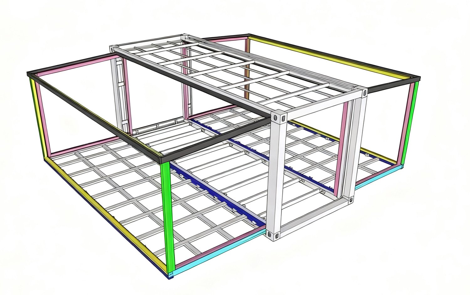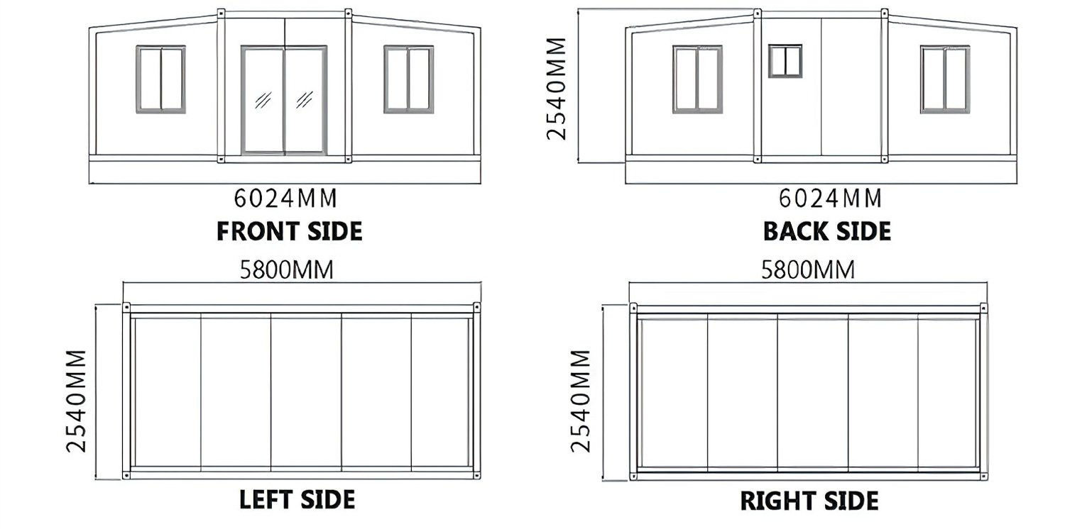 The foldable container house is made of high-quality steel and an integrated frame, ensuring durability and excellent seismic performance. The exterior wall panels are composed of composite sandwich panels: the surface of the sandwich panel is made of PPGI color steel sheets, while the core material can be PU/PUR/polyurethane or EPS. This structure enhances the house's fire resistance while guaranteeing thermal insulation.