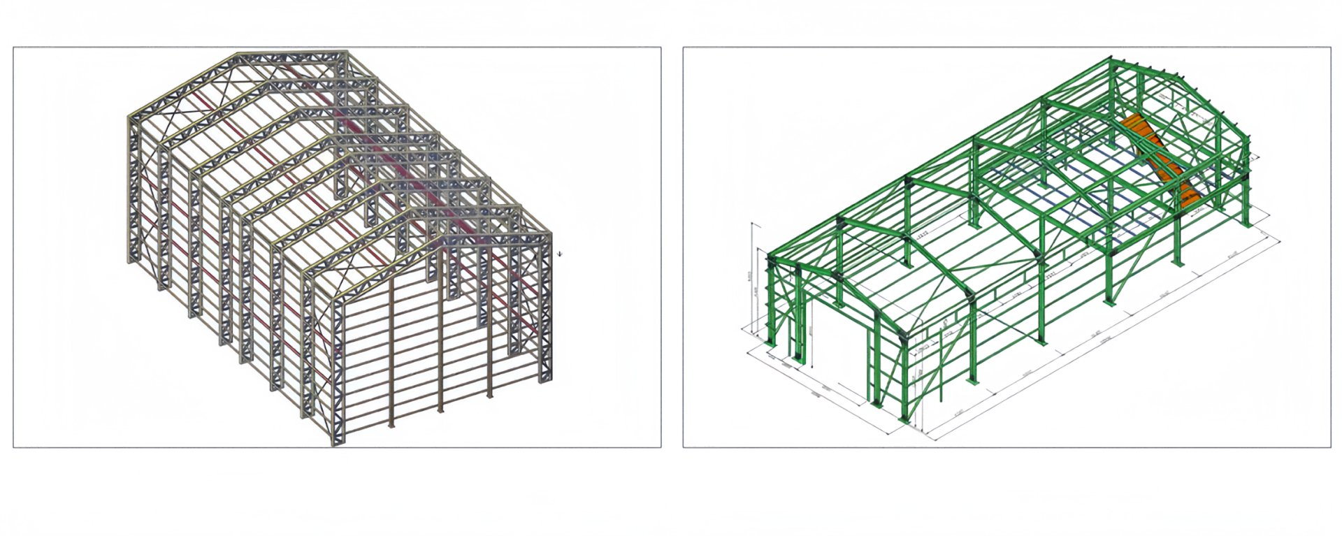 The main steel frame is mainly composed of components such as steel beams, steel columns, and steel trusses, which are processed from section steel and steel plates. These components undergo rust removal and anti-rust treatments such as shot blasting, painting, and galvanizing. Connections between components or parts are usually made by welding, bolting, or riveting. Our prefabricated steel structure buildings can be custom-designed to meet your exact requirements. The most common main frame systems are shown below, and almost any frame geometry can be achieved.